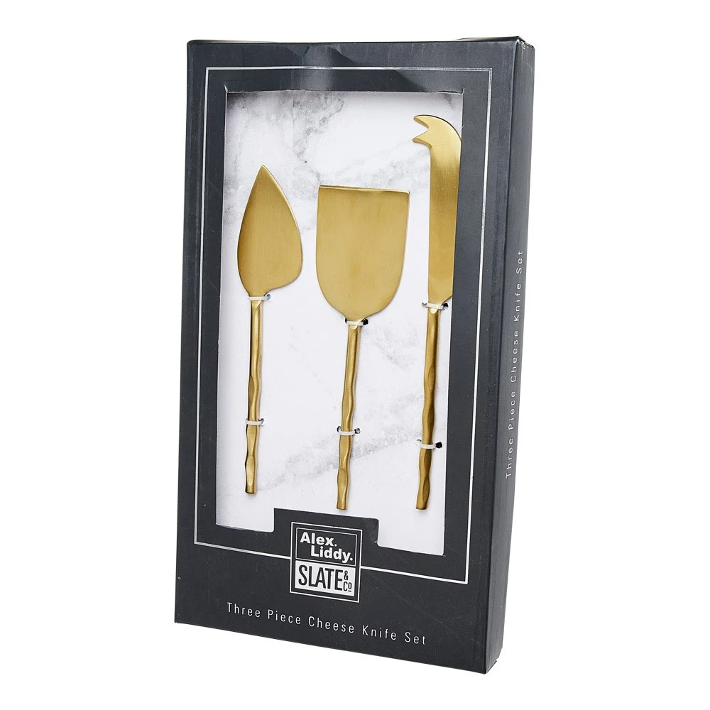 Complete your cheese or grazing platter with stunningly show-stopping accessories like the Alex Liddy Slate & Co Cheese Knives Set of 3 Gold.