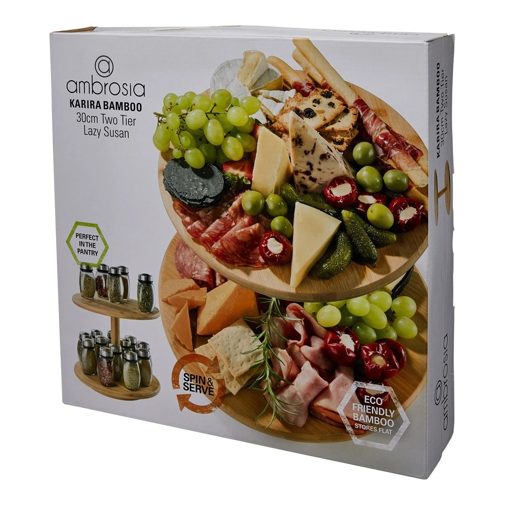 Create a showstopping, centrepiece grazing selection with the Ambrosia Karira Two Tier Bamboo Lazy Susan 30cm