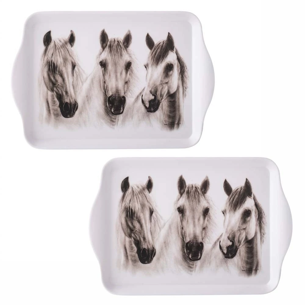 Bring an elegant touch to afternoon tea with a selection of cakes and sweet treats served atop the Ashdene Trio Set of 2 Scatter Trays Chestnut. Decorated with magnificent artwork by Danguole Serstinskaja, a master drybrush painter from Lithuania, the Ashdene Trio Set of 2 Scatter Trays Chestnut inspires your tabletop with its breathtaking beauty. On a clean white background, three regal chestnut horses are rendered in hyper-realistic greyscale. Crafted from highly resilient, dishwasher-safe melamine, the trays will adorn your tabletop with their beauty and practicality for years to come. Complement the Ashdene Trio Set of 2 Scatter Trays Chestnut with matching pieces from the exquisite Trio collection.