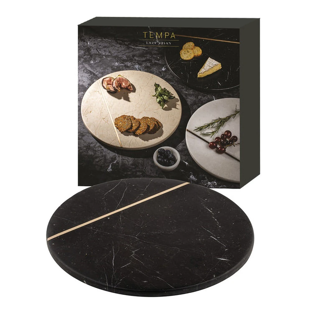 The beautiful Tempa Emerson Lazy Susan Black takes centre stage on the tabletop in any setting. Overflowing with luxury style, and not to mention entertaining practicality, the Tempa Emerson Lazy Susan Black features an inbuilt spinning base ensuring no one misses out on the decadent treats being served. Handcrafted from high-quality marble in a stunning rich black colourway, this must-have piece of serve ware boasts unique golden brass details for a touch of elegant decadence. With a food-safe lacquer to prevent stains, the Lazy Susan can be topped with an array of mouth-watering nibbles and canapes and effortlessly spun around to satisfy everyone at the table. Enhance your own entertaining collection, or give the fabulous Tempa Emerson Lazy Susan Black to a friend or loved one for a memorable gift they’ll cherish for years to come.